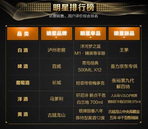 在酒类明星排行榜中,入围的商家有泸州老窖、百威、长城、马爹利、古越龙山。