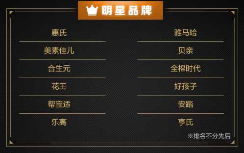 在母婴年度榜单中,排名前十的分别是惠氏、美素佳儿、合生元、花王、帮宝适、乐高、雅马哈、贝亲、全棉时代、好孩子、安踏、亨氏。