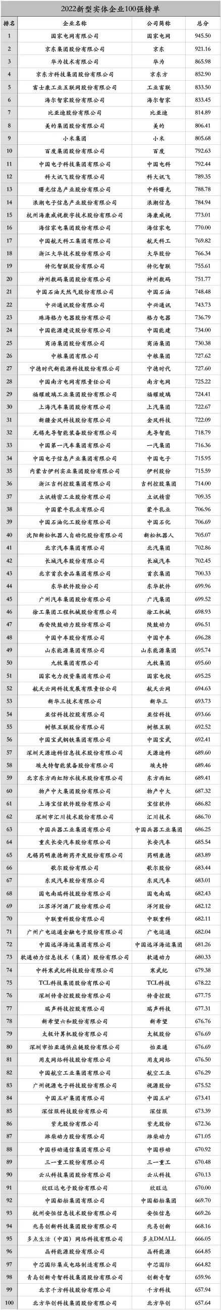 2022新型实体企业100强榜单发布!国家电网、京东、华为位居前三