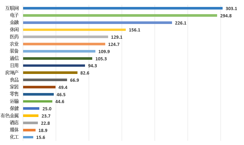 第一梯队单个行业的品牌价值超过200亿元,有3个行业,分别是互联网、电子和金融行业。第二梯队单个行业的品牌价值在50亿元-200亿元之间,有8个行业,即休闲、医药、农业、装备、通信、日用、房地产和食品行业。第三梯队单个行业的品牌价值小于50亿元,有8个行业,分别是家居、零售、运输、保健、有色金属、酒店、媒体和化工行业。
