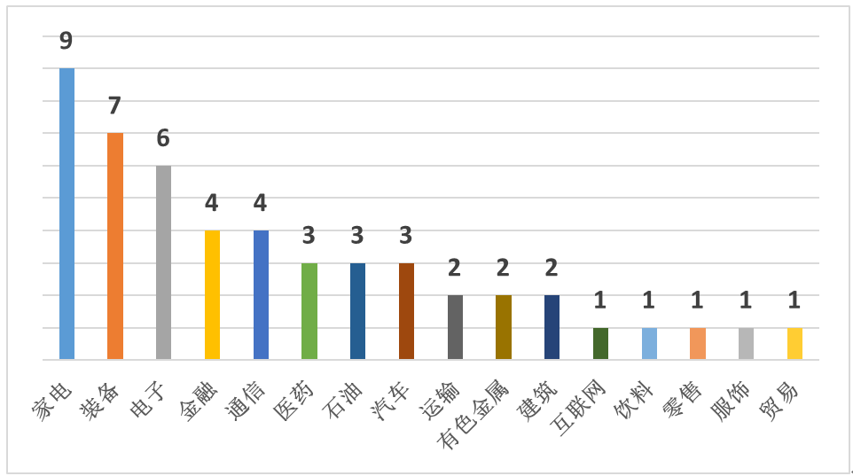 从行业数量分布看,在2023海外榜TOP50中,企业数量最多的是家电行业,有9家企业入围。入围企业3-7家的行业有7个,分别是装备、电子、金融、通信、医药、石油和汽车行业。其他8个行业的入围企业数量都不多于2家。