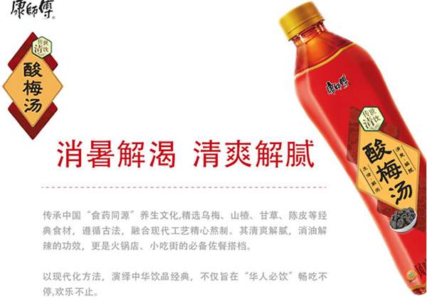 康师傅酸梅汤精选乌梅、山楂、甘草、陈皮,以传统古法经过长时间熬煮,萃取食材中有益成分,风味纯正浓郁,山楂的香醇加上梅子的清爽,是聚餐佐餐吃火锅的好搭档,清爽解腻,冰镇后饮用更佳。