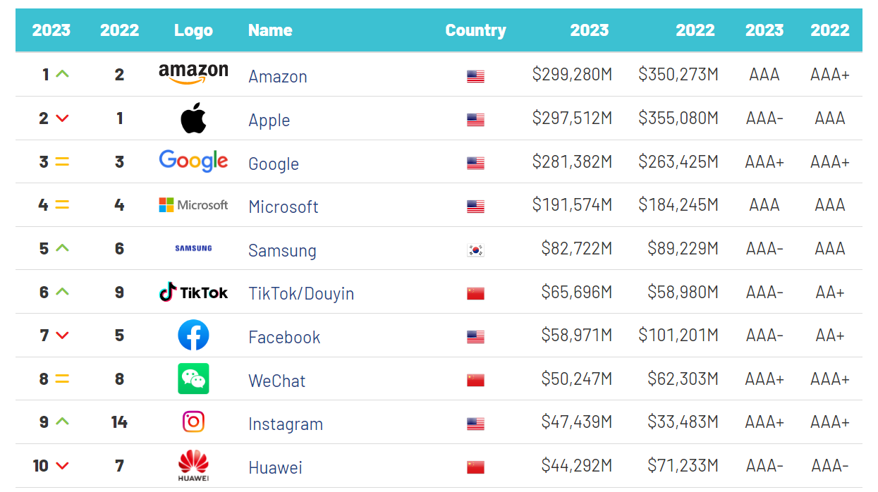 英国品牌评估机构“品牌金融” (Brand Finance) 近日发布的“2023全球科技品牌价值100强 ” (TECHNOLOGY 100 2023) 榜单显示,亚马逊超过苹果升至榜首,深圳科技品牌微信(WeChat)、华为(Huawei) 进入前十名,其中微信品牌排名较2022年持平,华为品牌排名从第7位将至第10位。