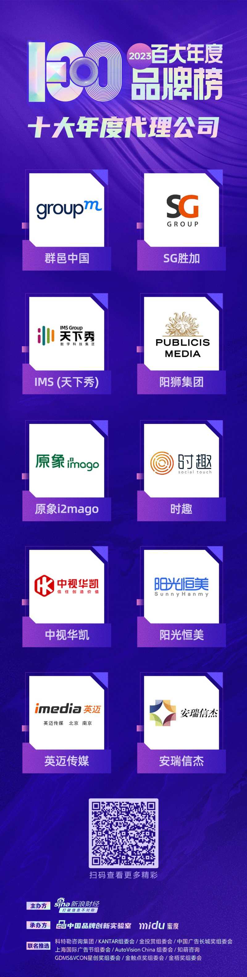 新浪财经和迎驾贡酒联合主办的首届生态品牌论坛暨2023“百大年度品牌榜”颁奖典礼在安徽霍山迎驾山庄举办。现场揭晓2023百大年度品牌榜之十大年度代理公司,他们是:群邑中国、SG胜加、IMS (天下秀)、阳狮集团、原象i2mago、时趣、中视华凯、阳光恒美、英迈传媒、安瑞信杰。以下是全榜单。