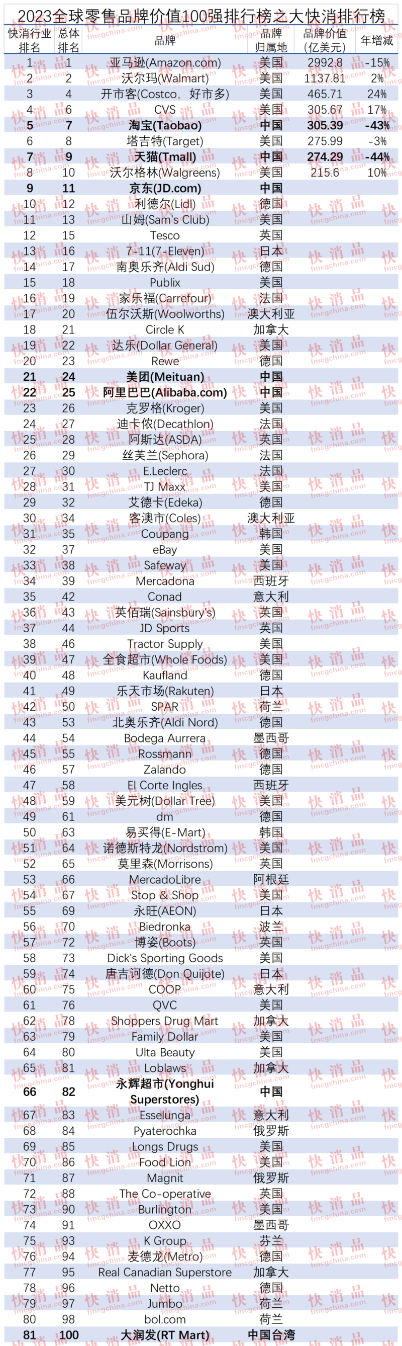 据《快消品》了解,亚马逊、沃尔玛、开市客在大快消零售中名列前三。中国品牌中,阿里巴巴集团旗下淘宝和天猫,以及京东都进入了前十名。在前100强的榜单中,有7个中国品牌。以下为具体排行榜: