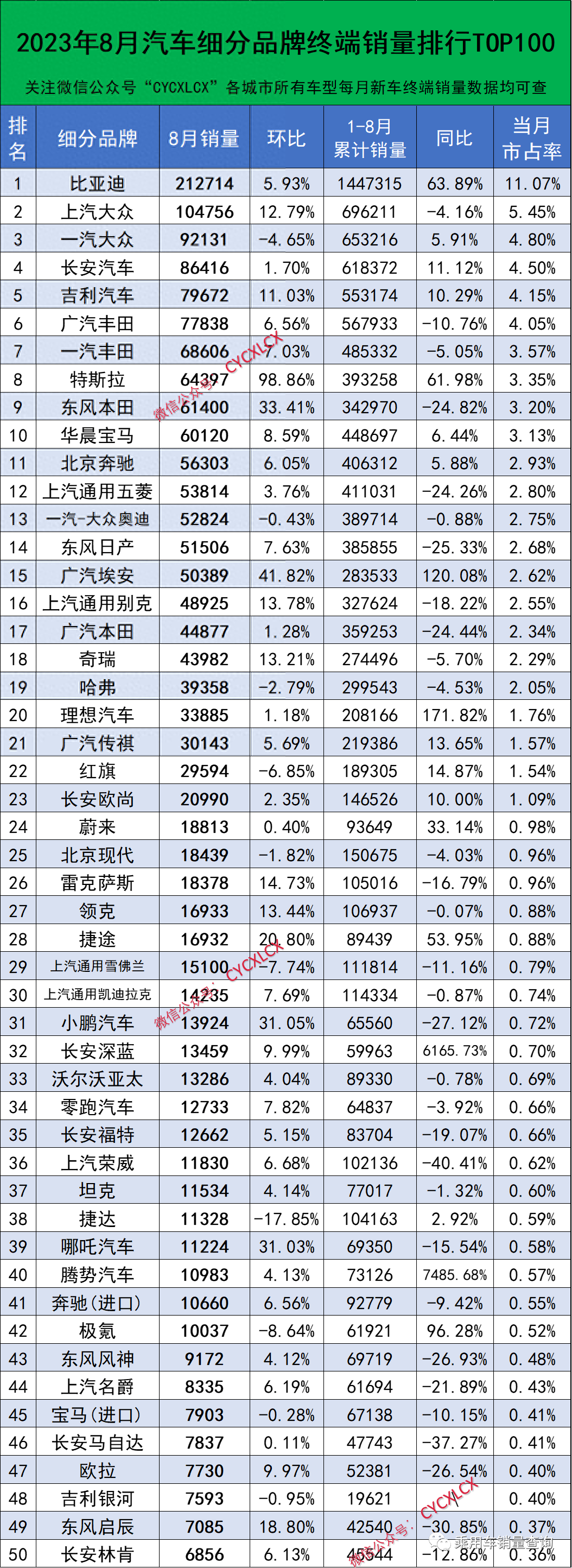 近日,乘用车销量查询公布了8月汽车细分品牌终端销量排行榜,数据显示,共100个品牌进入榜单,其中,销量超过万辆的有42个品牌,超过5万辆的有15个,超过10万辆的有2个。整体来看,2023年8月国内乘用车销量为192万辆,同比增长1.42%,环比增长7.8%,与上月相比实现增长的品牌有92个。