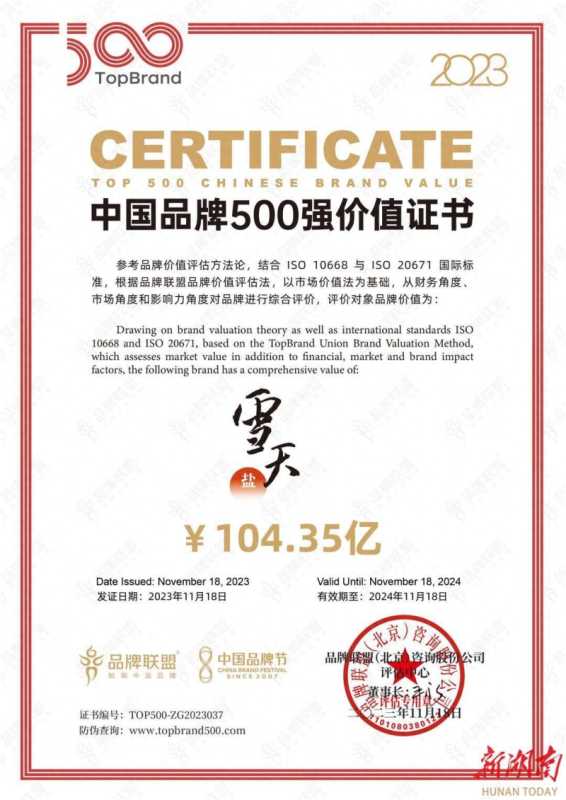 11月18日,以“复苏与腾飞”为主题的2023第十七届中国品牌节在杭州举行。政、商、产、学、媒等各界嘉宾6000余位济济一堂,共同见证民族品牌的崛起,携手奉献一场“品牌人的亚运会”。品牌联盟(Topbrand Union)发布了《TopBrand 2023 世界品牌500强》以及《TopBrand 2023 中国品牌500强》榜单。雪天盐业再次荣获中国品牌500强荣誉称号,品牌价值达到104.35亿元,排名第421位,比2022年提位40名次。