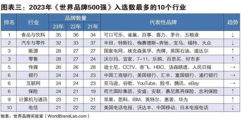 今年《世界品牌500强》共覆盖了47个行业。其中,食品与饮料共有35个品牌上榜,排名第一;汽车与零件共有32个品牌上榜,位居第二;零售行业继续复苏,今年有28个品牌上榜,和能源行业并列第三;传媒行业有26个上榜品牌位列第五。其他入选数量排名靠前的行业还有互联网(24个)、银行(24个)、保险(24个)、计算机与通讯(23个)和电信(21个)。随着世界范围内老龄化时代的到来,医药和健康品牌将会有可持续增长的空间。
