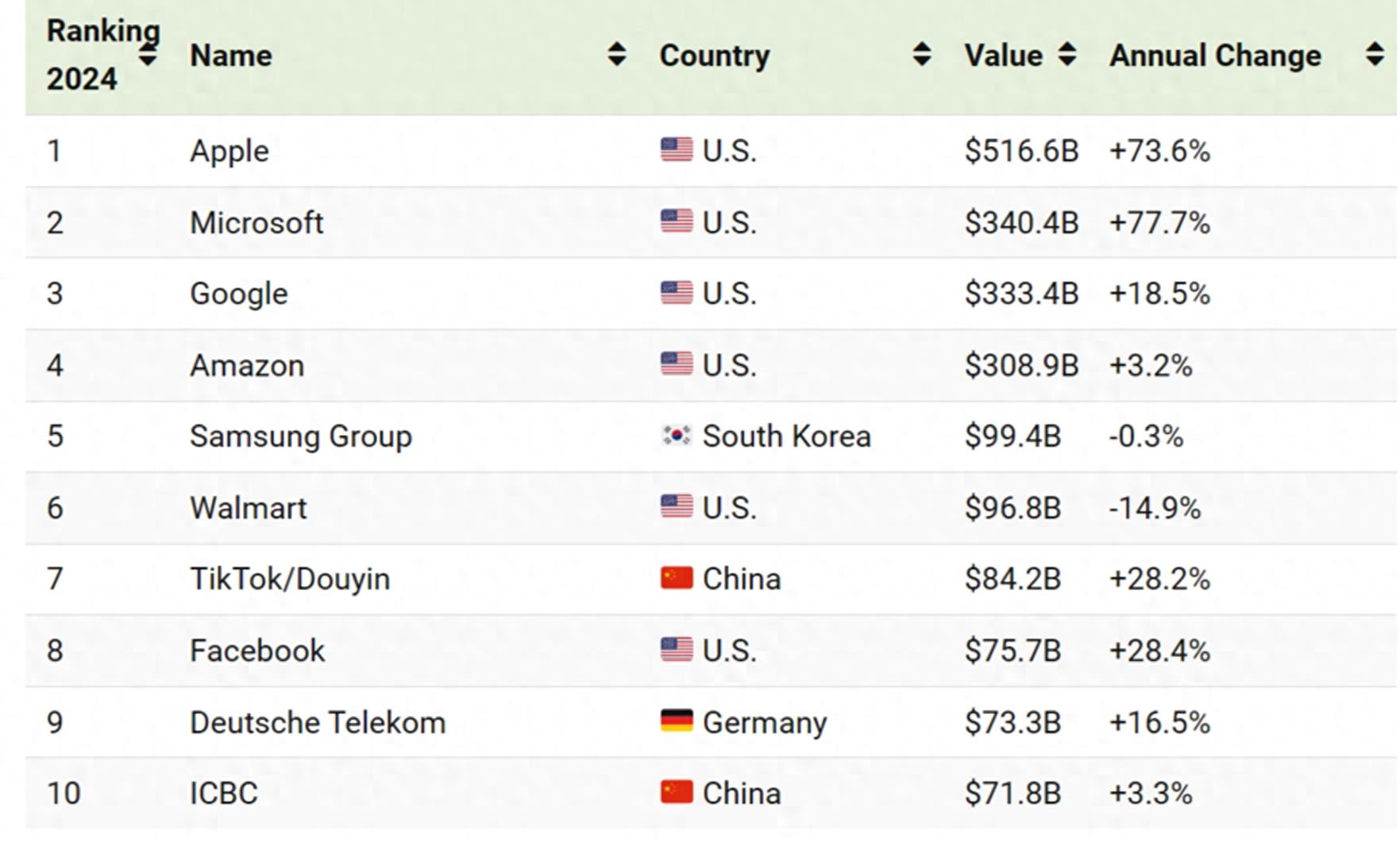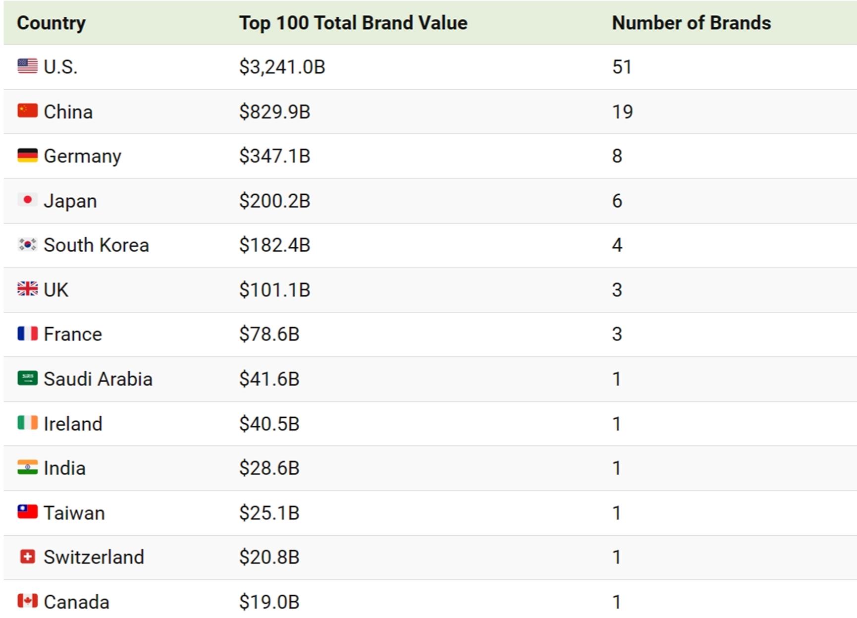 2024 年,100 个最有价值品牌中有一半以上位于美国,总价值达 3.2 万亿美元。