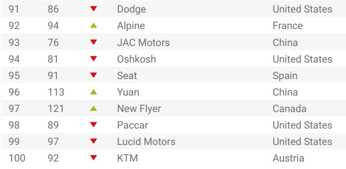 涨幅152%,品牌估值达到8.07亿美元,反映了该品牌在汽车领域的迅速发展和吸引力。