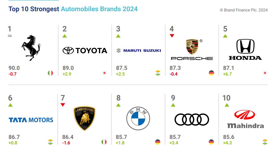 第二名的是丰田,第三名是铃木,第四名是保时捷,第五名是本田,第六名是塔塔汽车,第七名是兰博基尼,第八名是宝马,第九名是奥迪,第十名是马恒达。