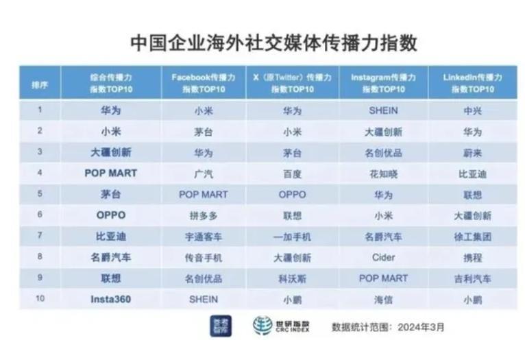 近日,有机构统计了中国企业在海外社交媒体的传播情况,并进行了传播力排名。