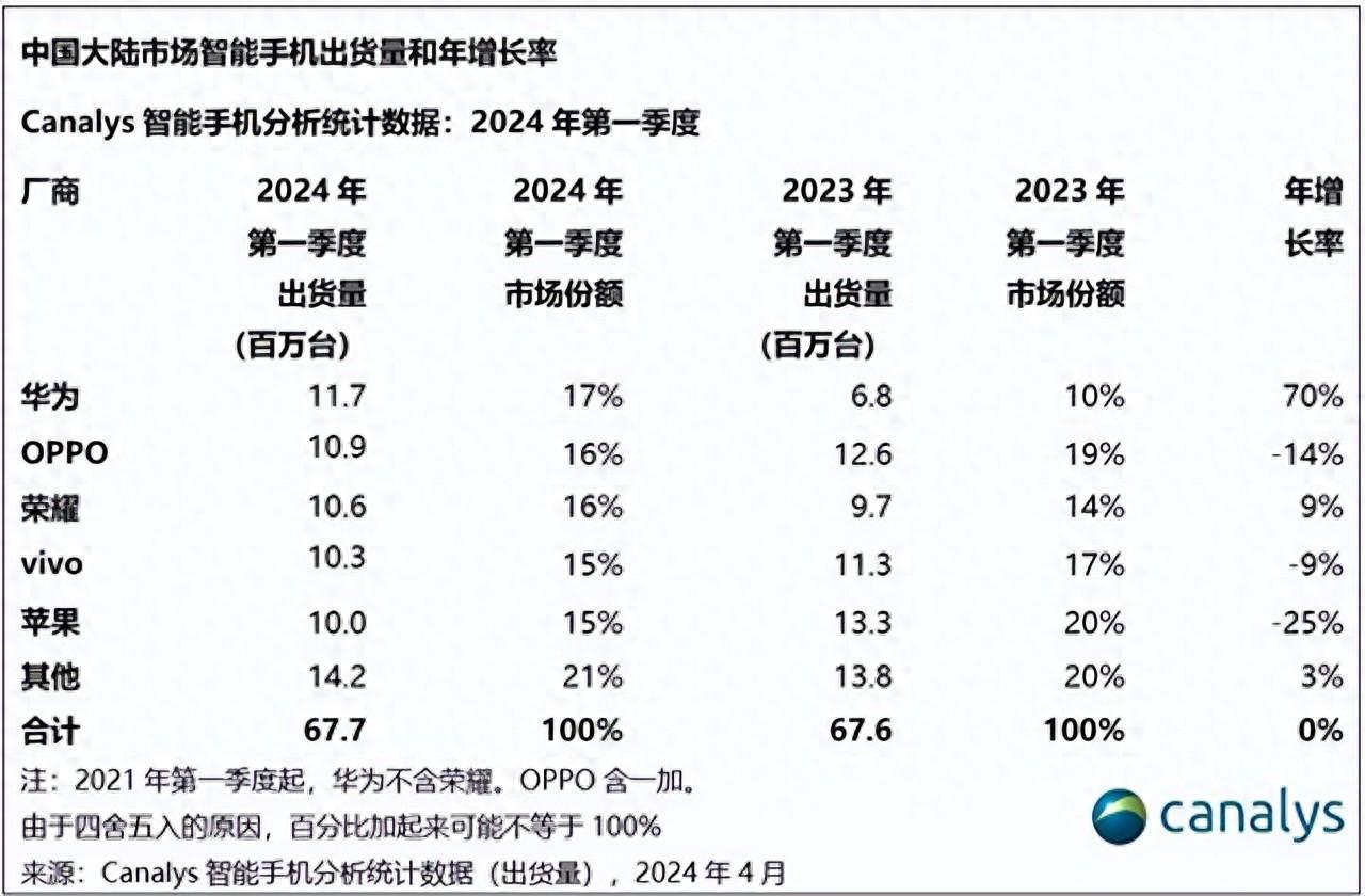 最近,第三方调研机构Canalys披露了2024年中国智能手机市场第一季度数据,华为在第一季度出货量1170万台,市场份额17%,同比增长70%,排名第一。这是华为自2019年芯片事件后首次夺回第一宝座。