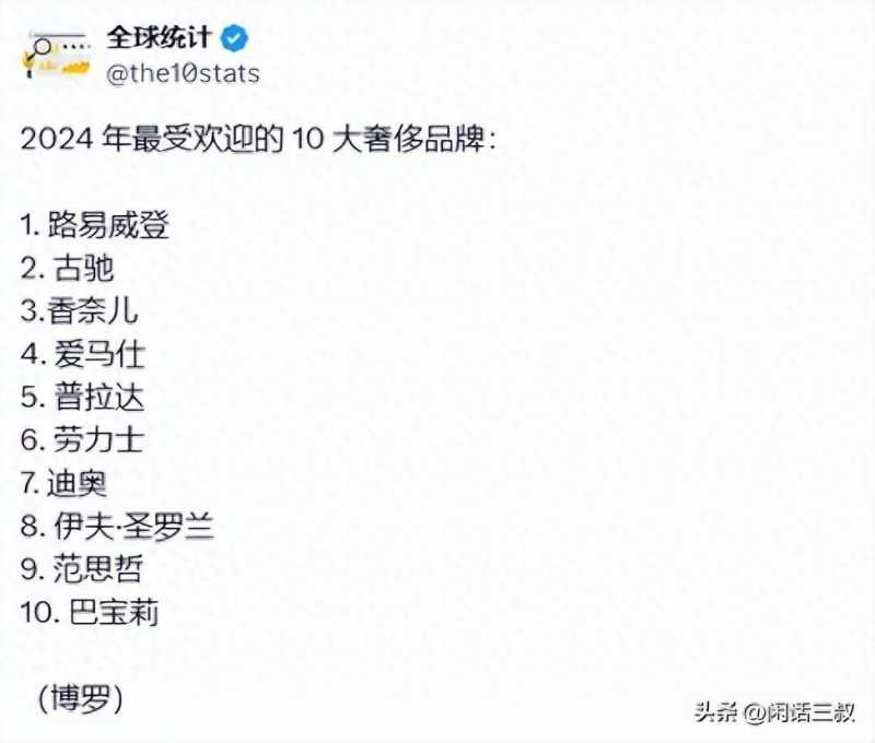 2024 年最受欢迎的10大奢侈品牌: 1. 路易威登 2. 古驰 3.香奈儿 4. 爱马仕 5. 普拉达 6. 劳力士 7. 迪奥 8. 伊夫·圣罗兰 9. 范思哲 10. 巴宝莉