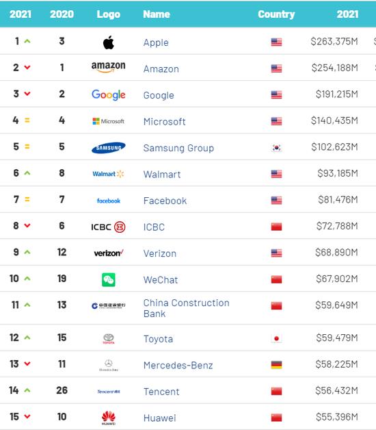 值得注意的是,在前15名的榜单中,有不少中国品牌上榜。这其中包括中国工商银行位列第8,微信位列第10,中国建设银行位列第11,腾讯和华为分列第14和15。此外,美国的微软、沃尔玛、Facebook、Verizon和前三的苹果亚马逊谷歌一起霸榜前十。