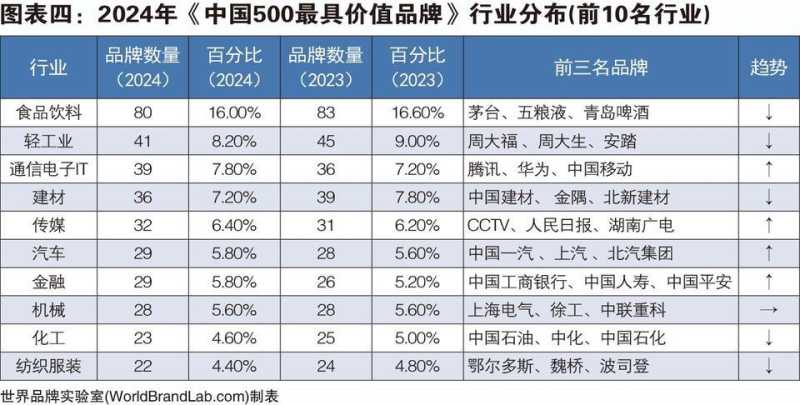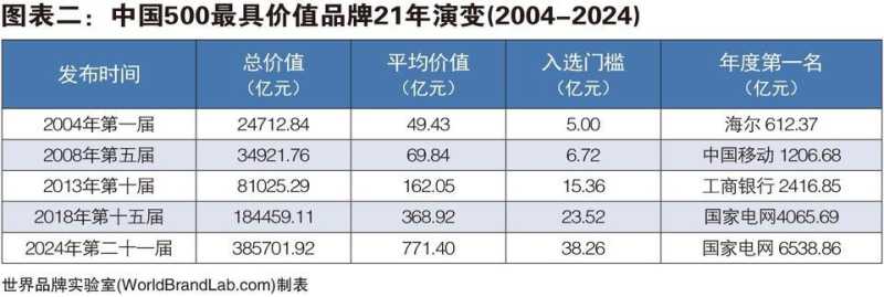 2024年《中国500最具价值品牌》的总价值为38.57万亿元,比去年增加4.24万亿元,增幅为12.35%。世界品牌实验室编制中国品牌报告已是第21个年头,2004年入选门槛仅为5亿元,前500名品牌的平均价值为49.43亿元。