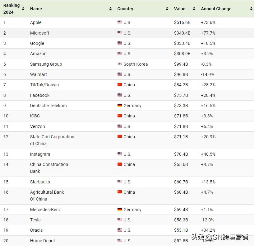 从更广阔的视角审视,美国品牌继续在全球最具价值排行榜上占据主导地位,截至2024年,世界前100强品牌中过半数源自美国,这些品牌累计价值高达3.2万亿美元,进一步巩固了美国在全球品牌经济中的领头羊角色,展现了其在创新与品牌建设方面的深厚底蕴。