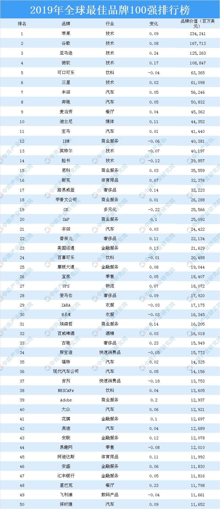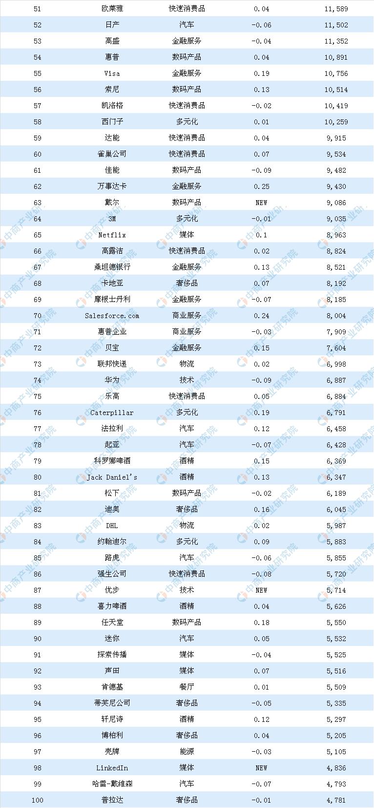 从行业来看,上榜最多的为汽车品牌,共15个,其次是银行和保险公司为主的金融服务品牌,共12个品牌上榜,快消品、奢侈品和技术行业分别有9个品牌上榜,但前十中有五个科技行业品牌。另外戴尔、优步和LinkedIn是新上榜的三个品牌。以下是2019年全球最佳品牌100强榜单详细排名情况: