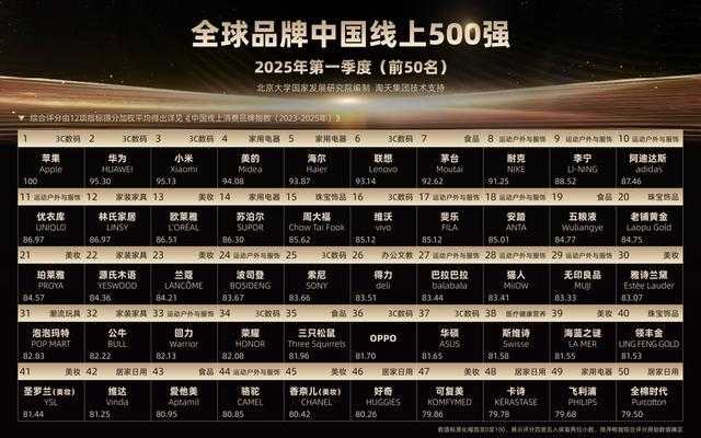 5月21日,北京大学国家发展研究院发布全球首个聚焦高质量发展的系列消费指数《中国线上消费品牌指数:2023-2025年》,研究团队基于淘宝天猫平台真实的销售、价格、搜索、好评等维度,对品牌质量进行综合性评分,并制订出全球首个完全基于消费者实际购买行为的品牌榜单“全球品牌中国线上500强”,最终苹果、华为、小米分列榜单前三名,成为最受中国消费者喜爱的消费品牌。