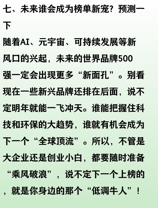 看完这次世界品牌500强榜单,真是感慨万千。大牌们依旧稳坐江山,但也有不少新面孔冒头,说明全球市场竞争真的越来越激烈了。品牌的价值不光靠历史积淀,更要靠创新和用户口碑。大家有没有发现,很多中国品牌也在慢慢崛起?未来说不定有更多我们熟悉的名字能进榜单,咱们一起期待吧!
