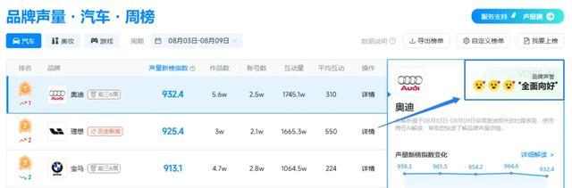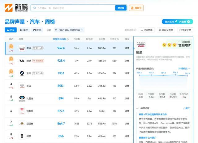 1. 新旧势力的“智能赛道”角力:本期「品牌声量·汽车周榜」,奥迪以932.4的声量新榜指数排名第一,其与华为乾崑智驾的深度合作成为核心卖点,在抖音“智能驾驶实测”话题中播放量超20亿次;而理想汽车以925.4的声量创历史新高,其L9车型的“城市NOA导航辅助驾驶”通过车主实拍视频在小红书刷屏,相关笔记超5万条。这说明,智能化配置已从“加分项”变为“必争项”,传统品牌借科技合作弥补短板,新势力则靠原生技术优势巩固阵地。