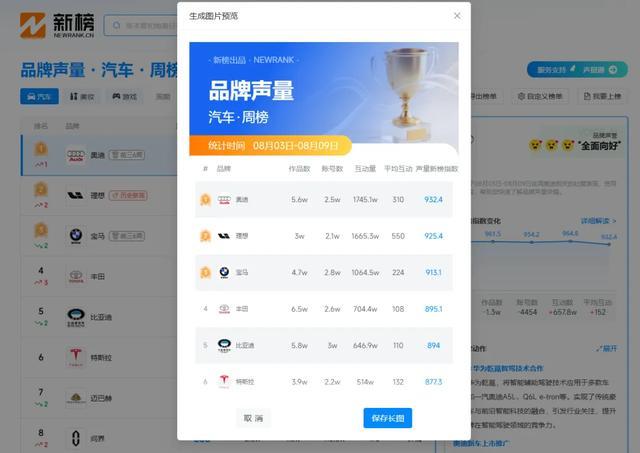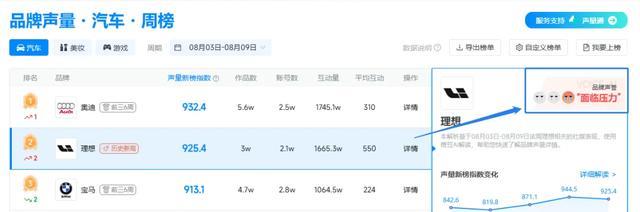 品牌声量榜依托新榜声量通,整合多维度数据为品牌提供量化参考。例如,理想汽车声量新榜指数达925.4,创历史新高,这背后有相应的作品数、账号数和互动量等数据作为支撑。通过这样的量化呈现,品牌能清晰了解自身在社交媒体上的传播效果和热度情况,从而有针对性地调整传播策略,提升自己在社交媒体上的影响力。