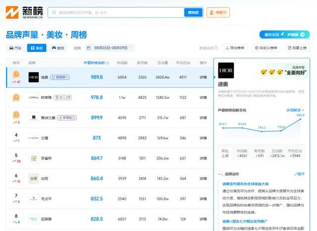 1. 品牌格局多元演变:本期「品牌声量·美妆周榜」,迪奥凭借精准的营销动作首次登顶,声量新榜指数达989.8,打破了欧莱雅、雅诗兰黛等传统头部品牌的长期垄断格局。与此同时,新兴品牌表现亮眼,如谷雨以“光甘草定”成分打造的美白系列在抖音、小红书持续热销,C咖则凭借“小罐膜”的差异化包装设计跻身声量前十。格局变化显示,美妆市场的竞争已从“品牌资历比拼”转向“创新速度较量”,无论是国际大牌还是国货新势力,都需通过快速响应市场需求抢占先机。