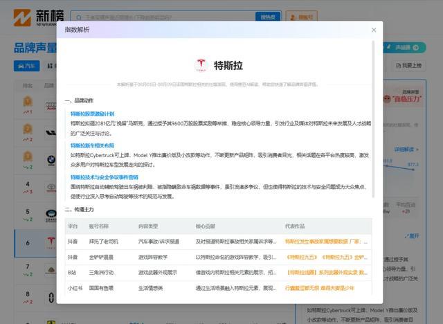 在每个品牌详情中,可以看到周声量新榜指数变化,同时基于AI拆解分析的品牌动作、传播主力、用户声音同步展示。以汽车行业为例,特斯拉某周的声量暴涨,背后可能是 “Model系列新车型上市+车主故事征集+科技博主在懂车帝等平台深度测评”的组合动作,品牌榜会把这些碎片化信息整合,让你一眼看清哪些动作真正带动了传播。