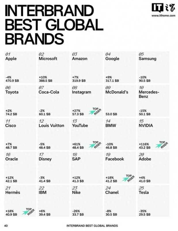 - Interbrand 公布 2025 全球最佳品牌榜:苹果第 13 年蝉联榜首