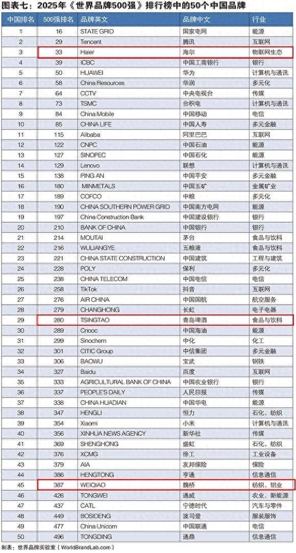近日,由世界品牌实验室编制的2025年度(第二十二届)《世界品牌500强》排行榜于12月17日在美国纽约揭晓,并在香港举行发布会。谷歌(Google)击败苹果(Apple)位列第一;微软(Microsoft)继续占据第二;苹果(Apple)退居第三。 中国共有50个品牌上榜,数量再次超越日本,稳居全球第三。其中,海尔(第33位)、青岛啤酒(第280位)、魏桥(第387位)3家山东企业入选。