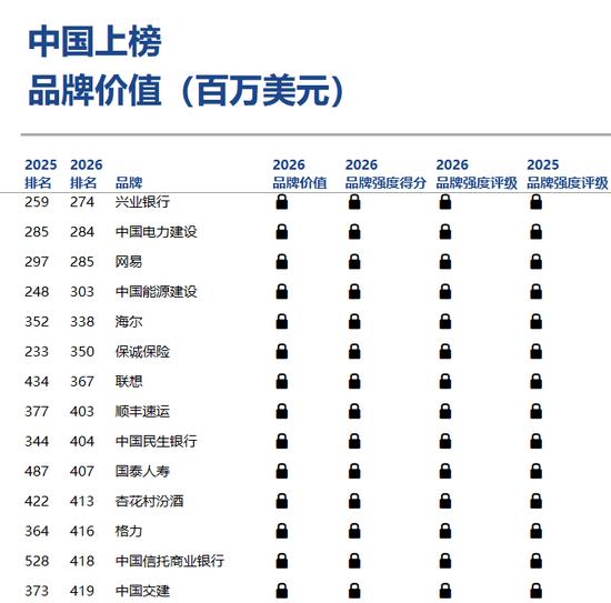 上榜的中国银行品牌还有中国建设银行(排名14)、中国银行(排名17)、中国农业银行(排名19)、招商银行(排名74)、中信银行(排名128)、中国邮政储蓄银行(排名134)、交通银行(排名167)、上海浦东发展银行(排名272)、兴业银行(排名274)、中国民生银行(排名404)、中国光大银行(排名461)、恒生银行(排名462)。