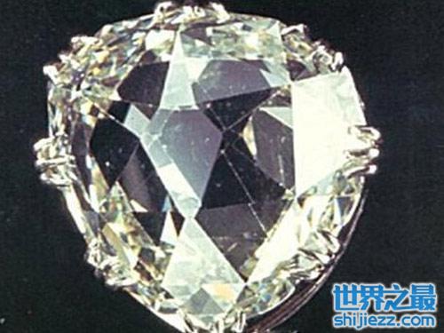 又名”黑色奥洛夫“,这是一颗扁平的梨形钻石,大小有如一颗鸡蛋。“神像之眼”重70.2克拉。传说它是克什米尔酋长交给勒索拉沙塔哈公主的土耳其苏丹的“赎金”。据说持有这颗黑钻的人便被下诅咒,三名前任持有者最后都跳楼自杀。”神像之眼“至今不知所踪。总之,”神像之眼“是一系列传奇,神秘,幻想的完美结合体,它的故事包含了崇拜,盗窃,掠夺,神秘失踪等变幻莫测的事迹。