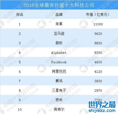 截止到2018年10月,全球最有价值的十大科技公司是:苹果(1.1万亿美元)、亚马逊(9620亿美元)、微软(8830亿美元)、Alphabet(8390亿美元)、Facebook(4600亿美元)、阿里巴巴(4120亿美元)、腾讯(3830亿美元)、三星电子(2970亿美元)、思科(系统(2240亿美元)、英特尔(2220亿美元)。
