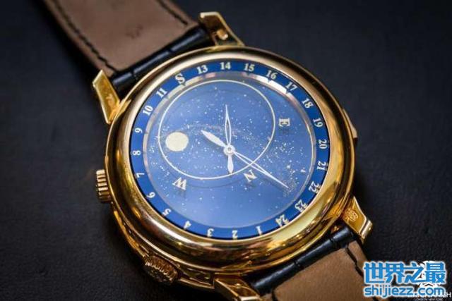这是世界上最稀有的手表之一,因为它有两个面孔。百达翡丽天空月球陀飞轮手工制作,由686个零件组成,其中一些只能用显微镜观察。手表背面显示恒定的时间。天空图追踪星星的运动和月球的轨道。