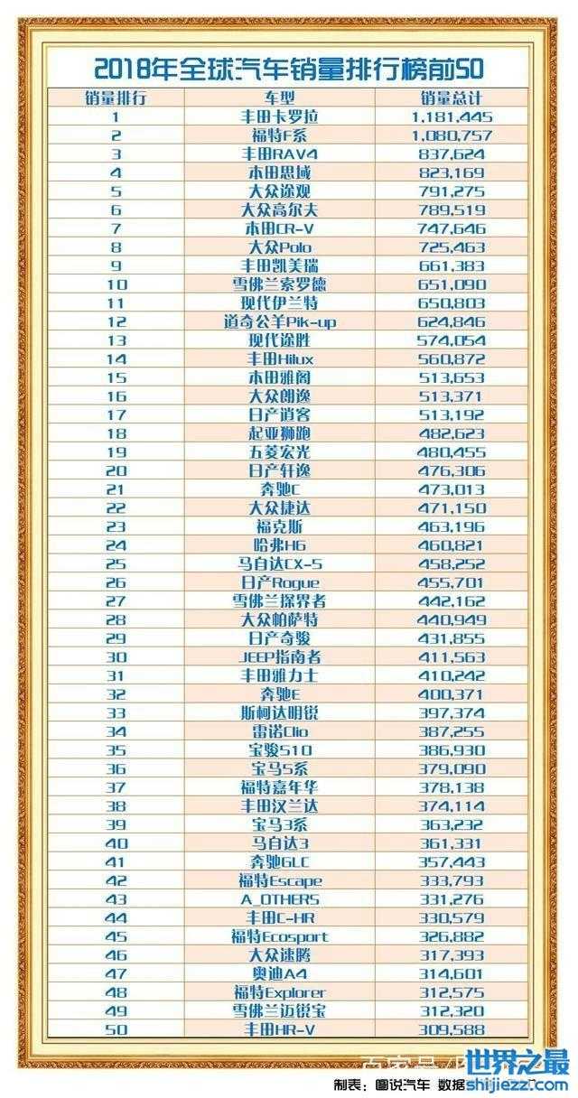 2018年全球汽车销量排行榜 丰田卡罗拉位居榜首