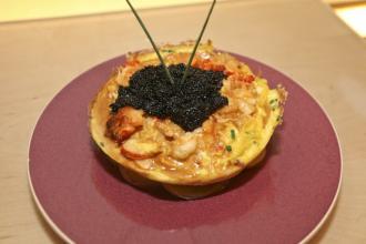 纽约“Le Parker Meridien Hotel”大酒店里的“Norma’s”餐厅出品了一道贵得惊人的鱼子酱龙虾馅煎蛋饼。这道煎饼是用龙虾钳、10盎司闪光鲟鱼子酱和6只鸡蛋做成的,售价一千美元。