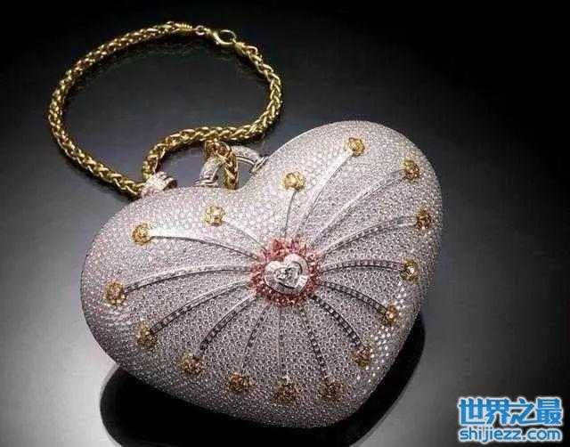 已通过吉尼斯世界纪录认证。这个心形的包完全纯手工制作,镶有4517颗钻石,其中4356颗白钻、105颗黄钻、56颗粉钻,总重量为381.92克拉。由十个著名的工匠一共耗时8800小时完成,价格380万美元。