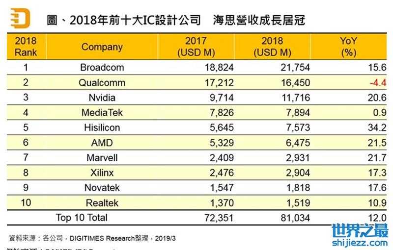 芯片是集成电路的一个体积很小的硅片,主要运用于电子设备和计算机等领域。今天小编为大家带来了2018全球十大芯片设计公司最新排名,位列榜单前三的分别是博通、高通和英伟达,中国华为海思排第五。2018年全球IC设计产值同比增长8%,达到1094亿美元,创下新高,高于封测和设备产业3%的增长率。从企业来看,全球前十大芯片设计公司总营收规模达到810亿美元,同比增长12%。其中博通同比增长15.6%,以217.54亿美元营收居首;高通同比下降了4.4%,以164.50亿美元继续位居第二。一起来了解一下吧!