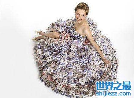 这款“钞票婚纱”是由英国设计师所设计的,婚纱的“面料”全部是用真钞票所制作的,仅仅其“面料”的价值就高达数百万美元,整件婚纱的价格估计是在1000万美元左右,折合人民币的话在6000万左右。