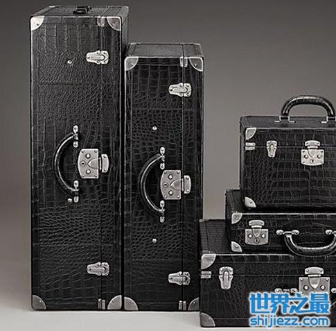 这款旅行箱是由鳄鱼皮制作而成,所有的皮革都全部来自于溢诺斯烟气味的棕色鳄鱼皮,而且公益节还采用了钢筋固定箱子的四角,添加抛光金属锁等硬件,非常具有视觉盛宴的效果,整套包括一个大箱子,一个小箱子,一个中等的细箱子,一个游览袋和一个化妆箱。