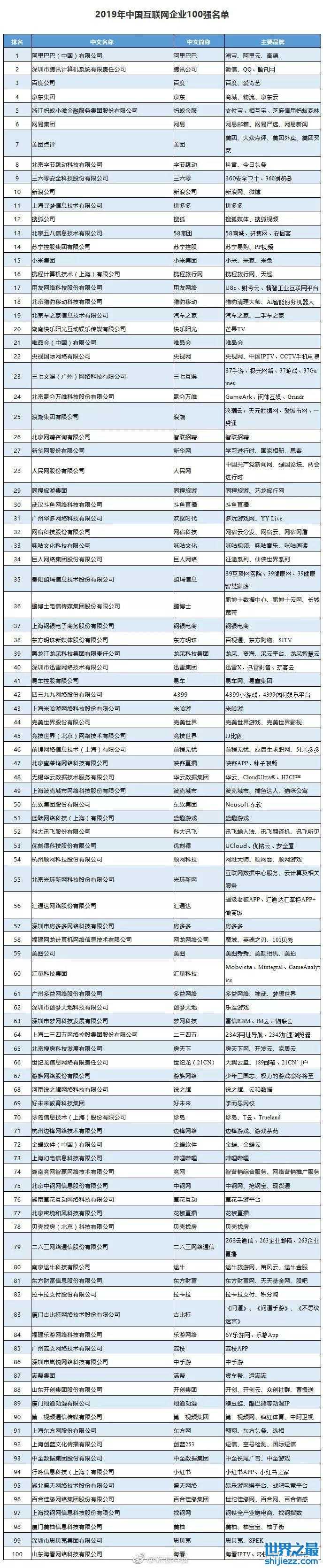 2019中国互联网企业100强名单,阿里巴巴夺冠