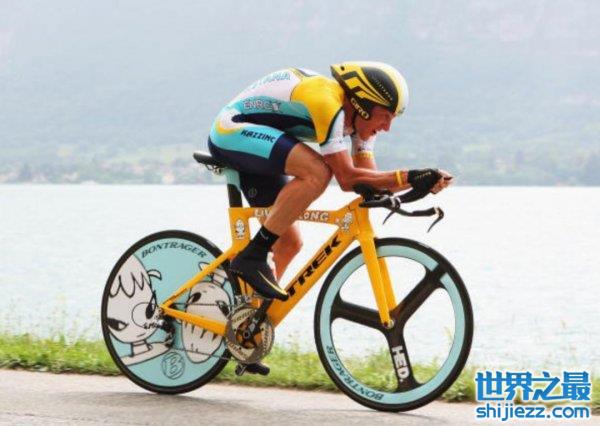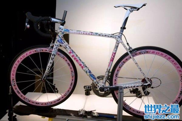 相对黄金自行车,钻石也是顶尖品牌们的最爱。而当响亮的品牌配上自行车名将,更是一笔精明的投资!这辆全世界独一无二的自行车在拍卖会上以52万人民币的价格成交。但相对它的售价,不知道买家是否能在这辆纪念版自行车上,感受到骑行的乐趣吗。2005年,在名将兰斯·阿姆斯特朗(Lance Armstrong)获得环法自行车赛7连冠之际,美国顶级自行车品牌TREK (崔克)趁机生产了Madone 7钻自行车。这辆绝无仅有的自行车,车身整整装饰了100颗白钻石,车身前部则以7颗1克拉人工钻石,打造阿姆斯特朗夺冠的“7”字标识。