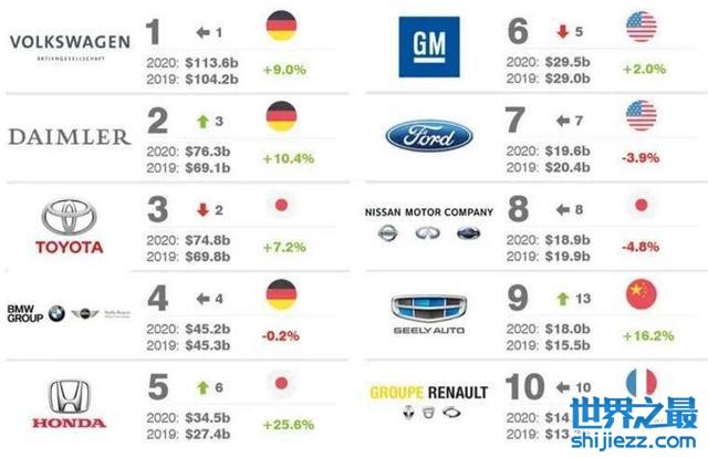 2020全球十大汽车集团排名,吉利位居第九名