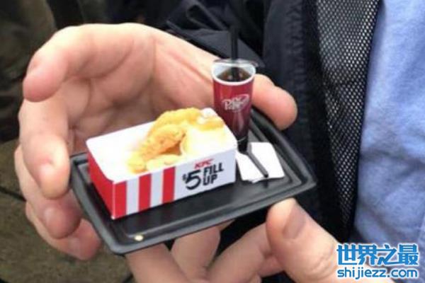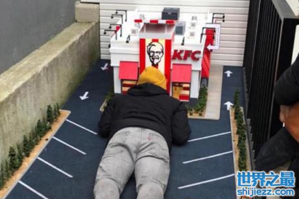 但是由于店铺过小,顾客在购买食物的时候,都必须要趴在地上才能和窗口对上,所以在这家肯德基的门前设置了巨大的停车场,连两旁的树也是迷你型的,当顾客趴下的时候正好不会弄脏,而且他们售卖的种类还非常多,有指甲大的炸鸡和瓶盖大的汉堡等,几乎和真实的肯德基门店丝毫不差,不过这样的5美元套餐可能点了二十份的套餐也无法填饱肚子。