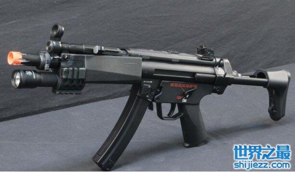 MP5系列是由德国军械厂黑克勒-科赫所设计及制造的冲锋枪。由于该系列冲锋枪获多国的军队、保安部队、警队选择作为制式枪械使用,因此具有极高的知名度。它的后坐力极小,甚至单手就可以进行射击,因此这也使得它的精度非常的高,曾经在摩加迪机场的一场反劫机运动中,5名恐怖分子几乎都被MP5射中,其中4人死亡,人质没有受伤。而且它威力也非常强,射速能够达到每分钟800发,在100米之内可以全部子弹射中直径20厘米的范围内。