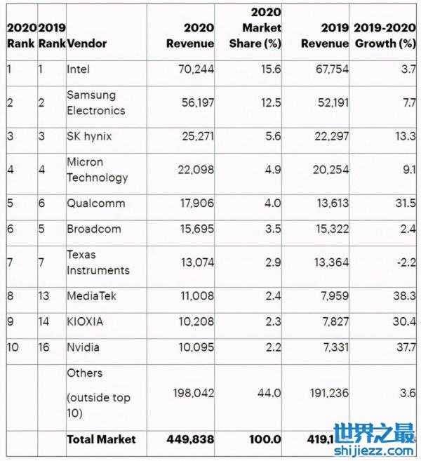 全球芯片巨头前十名:英特尔第一,华为落榜