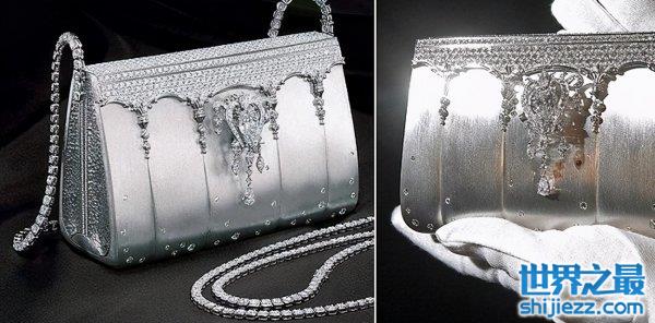美国Mouawad公司的这款“1001 Nights Diamond Purse”正式获得吉尼斯世界记录的认证。整款包包由18K黄金手工制作,由10名技艺高超的匠人耗时8800小时完成,制作此款包包共使用了4517 颗钻石(包括105颗黄钻、56颗粉钻、4356颗白钻),钻石总重达381.92克拉。