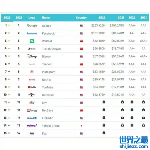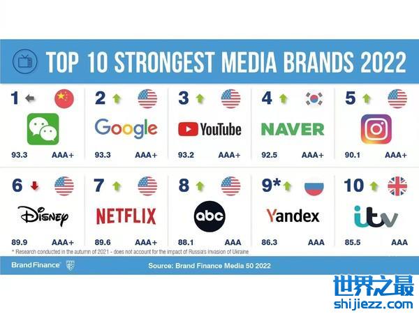 在品牌的评级方面,所有品牌都取得了AAA级以上的评定以及85以上的高分。但是与品牌价值榜单不同的是,在品牌评级的榜单中,微信以93.3分和AAA+的成绩取得了首位,领先第二名谷歌。不过,在这个榜单中,前十名只有微信一家中国品牌在列,其余均为海外品牌,例如谷歌、YouTube、网飞等等。