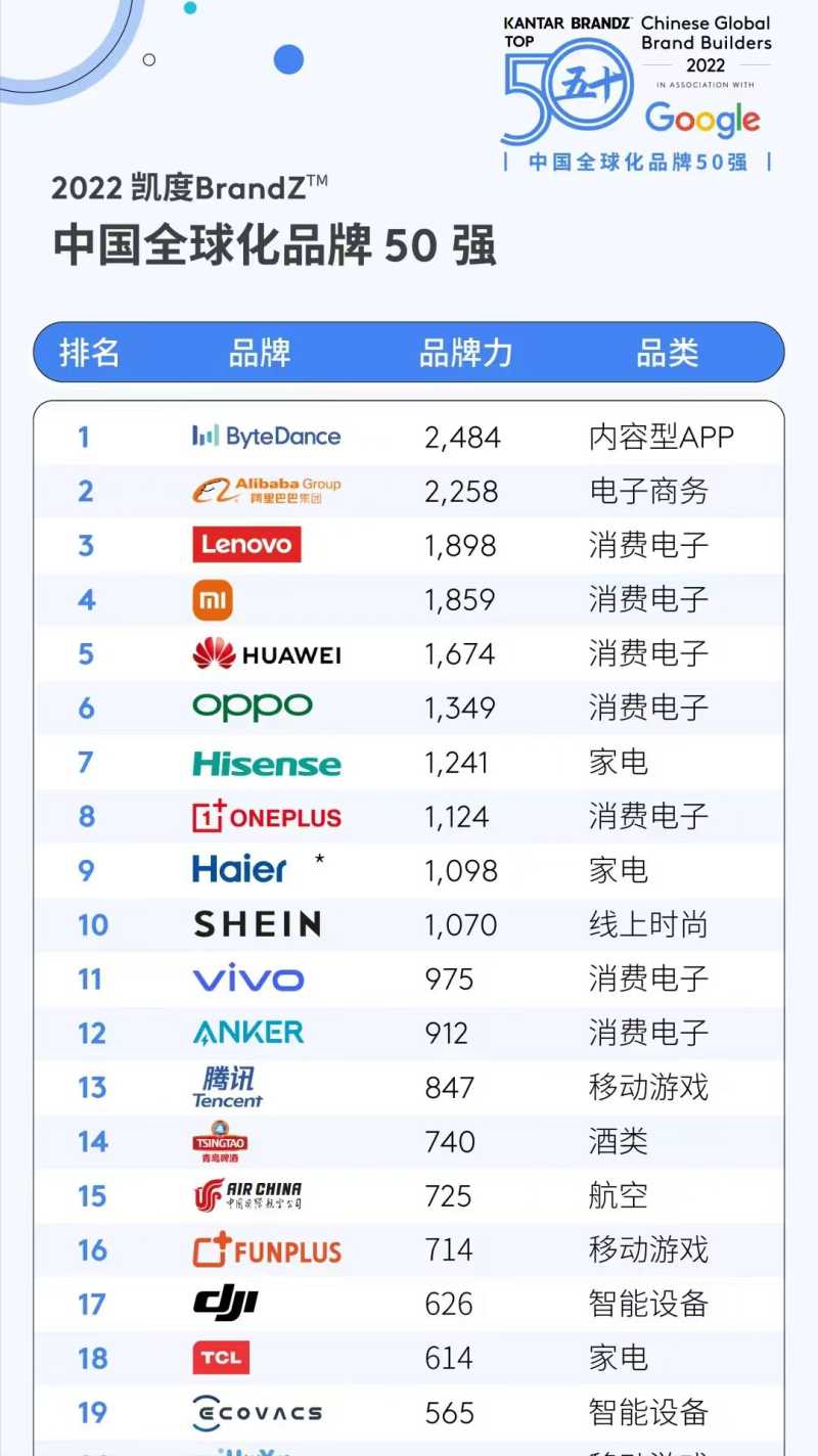 谷歌联合凯度,发布了最新的《凯度BrandZ™中国全球化品牌50强》榜单,引起了不小的关注。能上榜的大都为互联网科技企业,其中位于前列的也都是网友们耳熟能详的企业,一起来看看有哪些吧。
