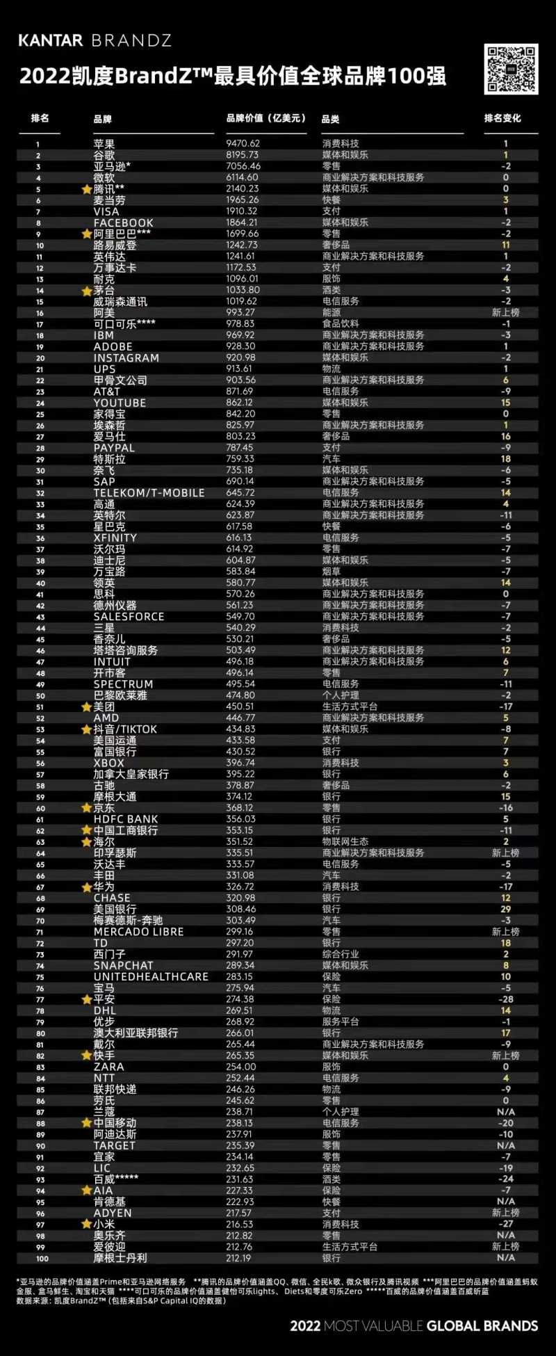 BrandZ最具价值全球品牌排行榜由全球知名洞察和咨询机构凯度集团权威发布,榜单量化了品牌为企业财务表现所做出的的贡献,直接反映着推动全球最大品牌的关键趋势,是目前业内公认的最权威品牌价值研究榜单之一。